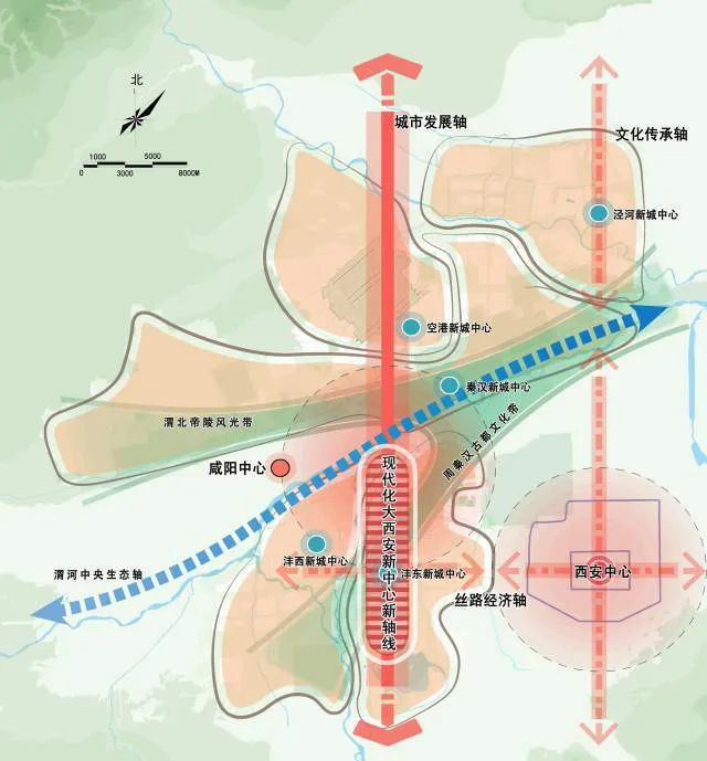 大西安新中心轴线遵循历史文脉和山水格局,北起嵯峨山,贯穿沣河主脉,串联了丰镐京遗址等历史文化地标,承载着西安建设国际化大都市的使命。由北至南分布着丝路能源金融贸易区、科技统筹区、文化生态区三个重要城市功能区,连接了西安咸阳国际机场、能源金贸中心、自贸区、昆明池等城市重要功能区。